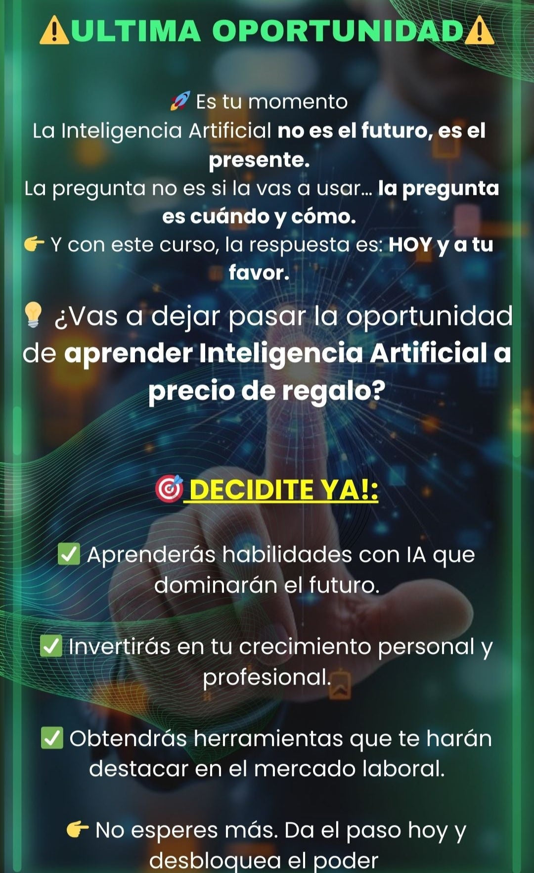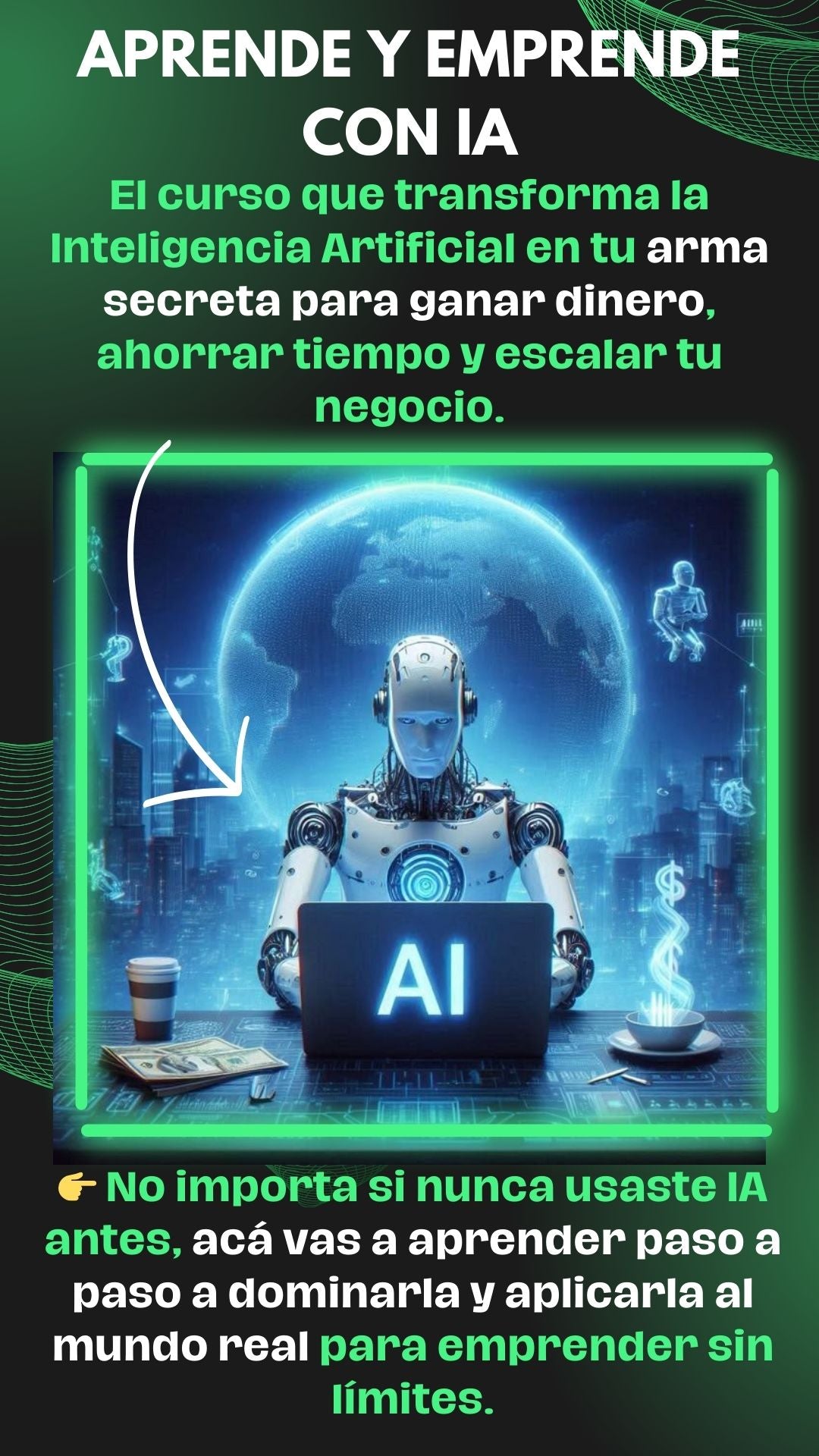 No, para nada. Este curso está diseñado para principiantes absolutos. Te guiamos paso a paso desde cero hasta que puedas aplicar la IA en tu negocio o proyectos personales.